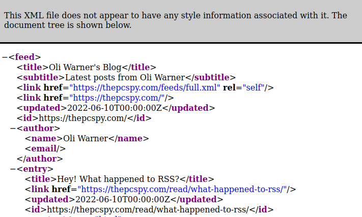 If you click a link to my main feed, your browser might pretty-format the XML code but that’s all the help you get. Update: The raw RSS is now styled via XSLT so it does at least look better than a page of XML. More at the end.