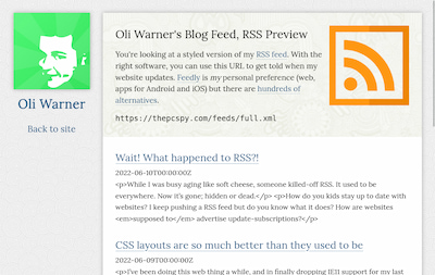 With it you can transform an RSS feed into something that looks like a normal web page. And explain what to do next, if they don’t already know. My XSLT is super-simple, please have a look. I’ve dropped in a message explaining what RSS is, that you need an aggregator. It might be nice to offer email subscriptions from here directly one day.