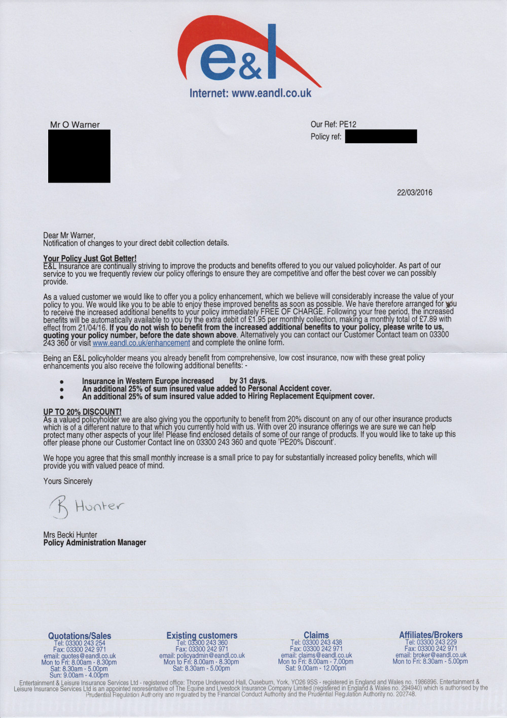 Just stepping back, you get an indication of the scale of this shake down by the simple fact that E&L has a upgrade-declination page. E&L does a lot of types of insurance and this page covers all of them. What else are they extending cover for without solicitation? Third wheels on bicycles? 50% more legs on horses?
